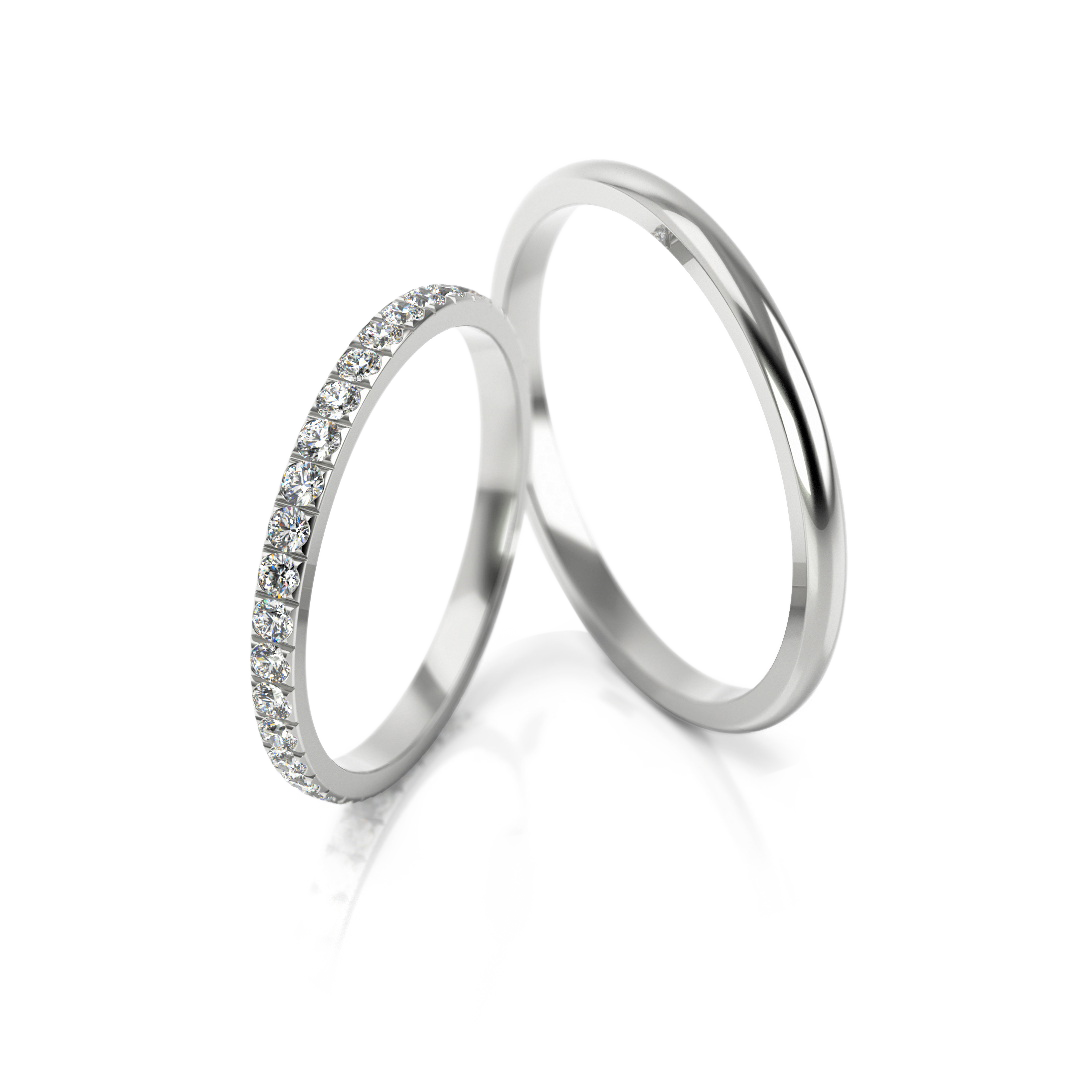Der Damenring ist vollständig mit funkelnden Steinen besetzt und begeistert mit einer Gesamtmasse von 0.57 ct, die dem Ring eine außergewöhnliche Strahlkraft verleiht. Der Herrenring ergänzt das Set mit einer glatten, polierten Oberfläche und klaren, reduzierten Linien. Diese Trauringe sind ideal für Paare, die ein exklusives, modernes Design mit einem Hauch von Extravaganz suchen. Die schmale Form unterstreicht die Leichtigkeit der Ringe und macht sie zugleich zu einem stilvollen Statement für besondere Verbundenheit.