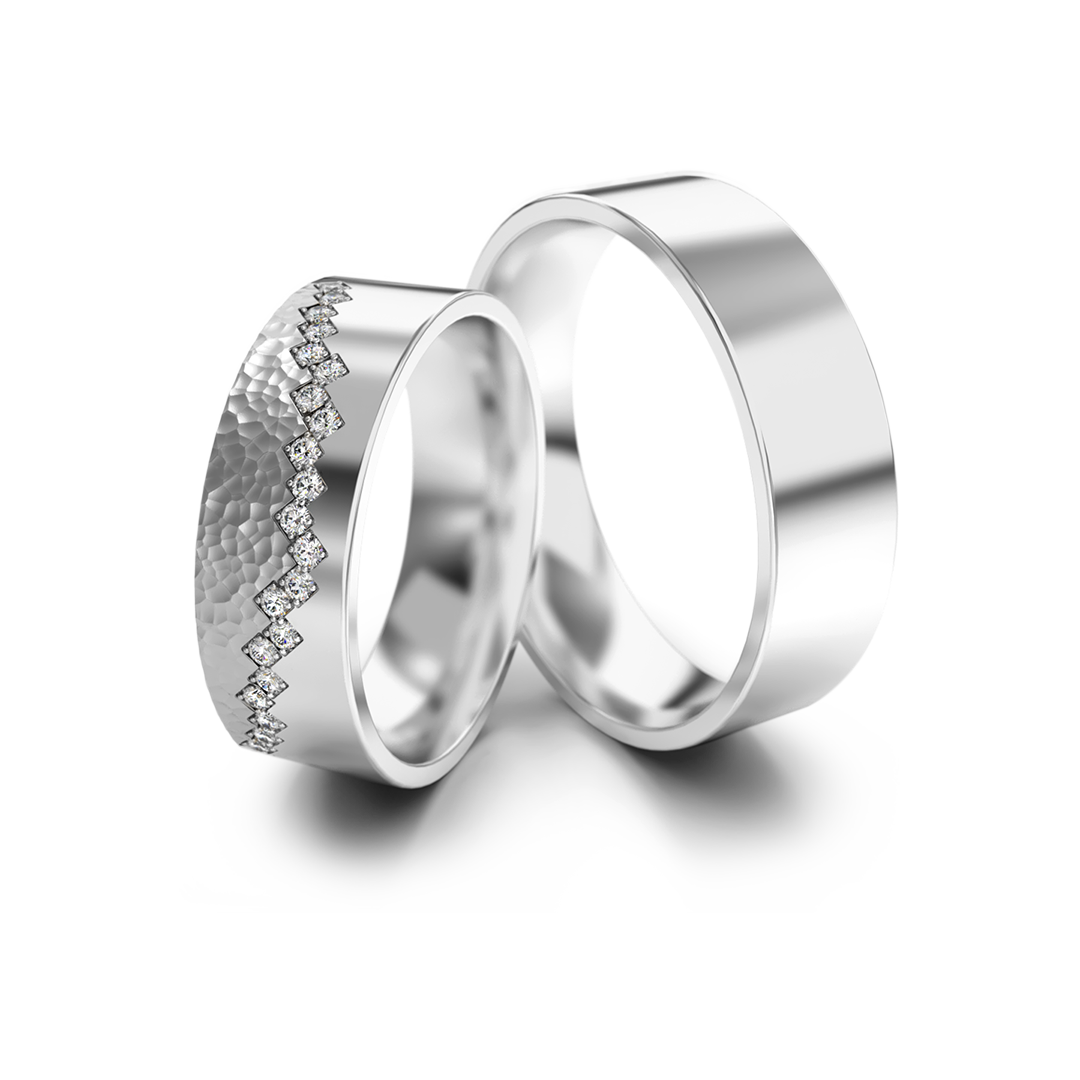 Moderne Eheringe in neun Varianten aus Gelbgold, Weißgold, Roségold und Bicolor. Damenring mit gehämmerter Oberfläche und 0.21 ct Steinbesatz, Herrenring glatt poliert. Breite 6 mm – hochwertige, elegante Trauringe für moderne Paare.
