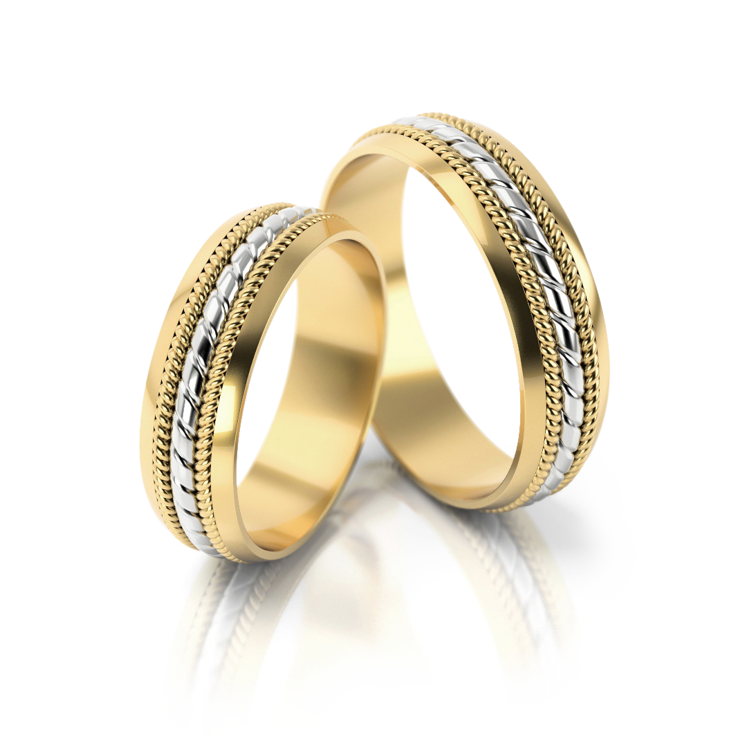 Standardmäßig wird dieses Modell in Gelb-Weißgold gefertigt. Auf Wunsch sind die Ringe auch in Gelbgold, Weißgold oder Roségold erhältlich. Durch die Auswahl der Legierungen von 333 bis 750 können die Ringe perfekt an persönliche Wünsche angepasst werden. Diese Trauringe sind ideal für Paare, die ein warmes, romantisches Design mit Vintage-Charakter lieben.