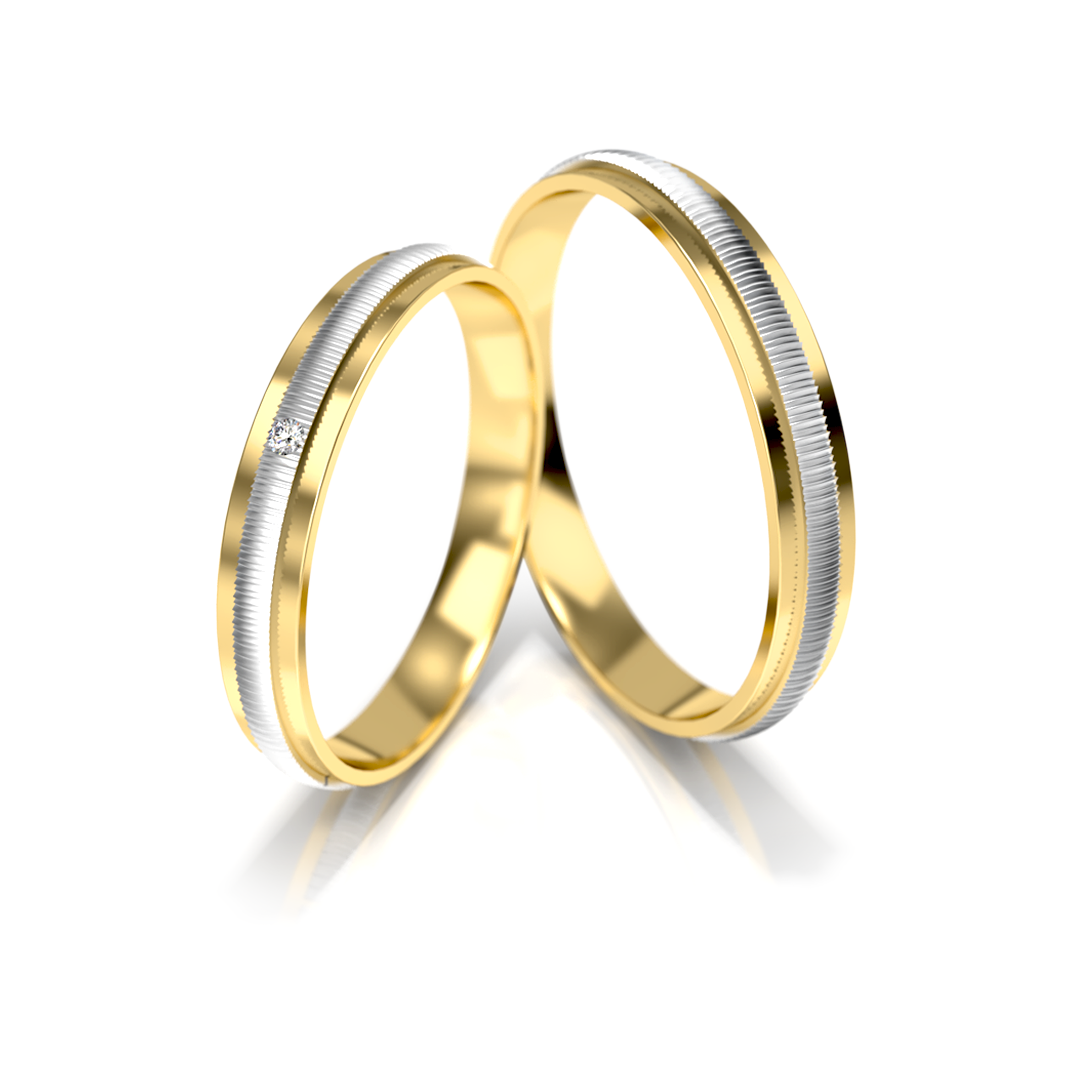Die Ringe sind in zwei Bicolor-Varianten erhältlich, bei denen Gelb- und Weißgold unterschiedlich angeordnet sind. Auf Wunsch können sie auch in anderen Edelmetallen gefertigt werden. Dank der schlanken Form und der harmonischen Proportionen eignen sich diese Trauringe ideal für Paare, die klassische Eleganz in einer besonders feinen Ausführung schätzen. Erhältlich sind die Ringe in den Goldlegierungen von 333 bis 750.