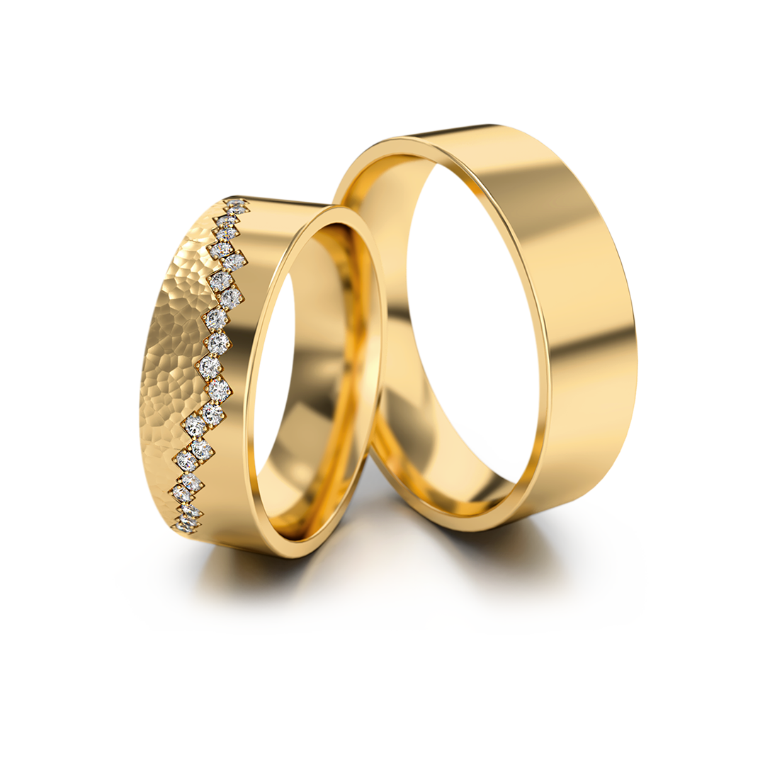 Moderne Eheringe in neun Varianten aus Gelbgold, Weißgold, Roségold und Bicolor. Damenring mit gehämmerter Oberfläche und 0.21 ct Steinbesatz, Herrenring glatt poliert. Breite 6 mm – hochwertige, elegante Trauringe für moderne Paare.
