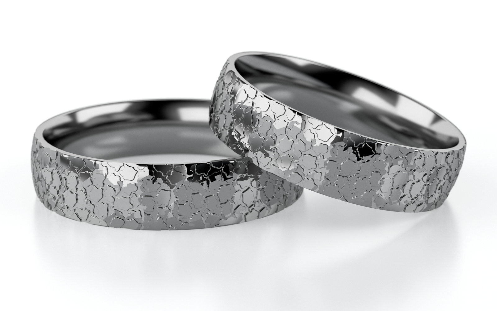 Die organisch wirkende Gravur aus kleinen, unregelmäßig geformten Facetten erzeugt ein lebendiges, fast mosaikartiges Muster, das das Licht auf vielfältige Weise reflektiert. Diese raffinierte Gestaltung macht die Ringe zu einem Blickfang, ohne ihre klare, moderne Form zu überladen.