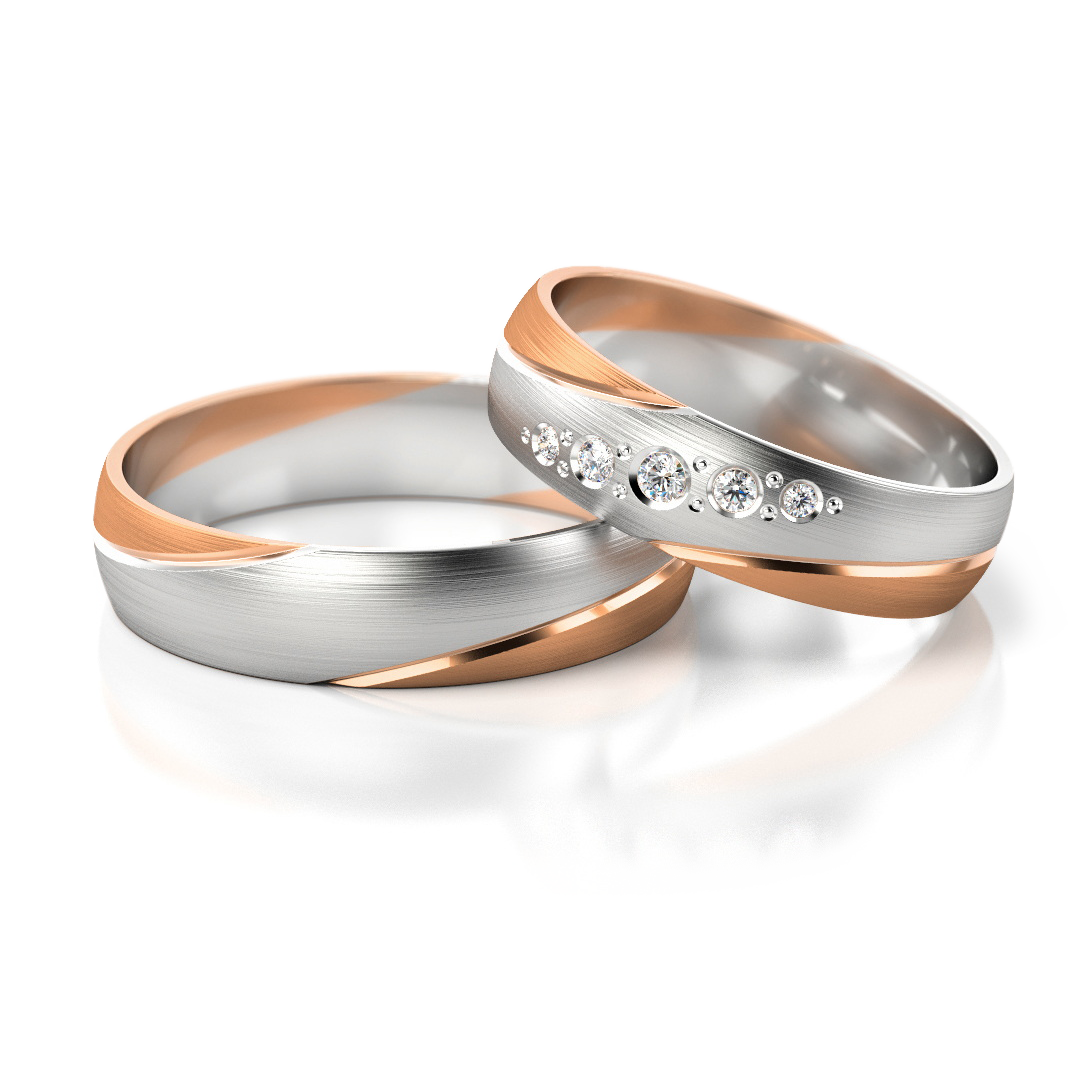 Trauringe Nr. 302 mit lockerer Interpretation des V-Motivs und dynamischen Schrägen. Die fließende Linienführung verleiht dem klassischen Design eine moderne Spannung, während der feine Steinbesatz im Damenring elegante Akzente setzt. Erhältlich in Gelbgold, Weißgold, Roségold sowie in verschiedenen Bicolor-Varianten. Breite: 5 mm, Höhe: 1,2 mm
