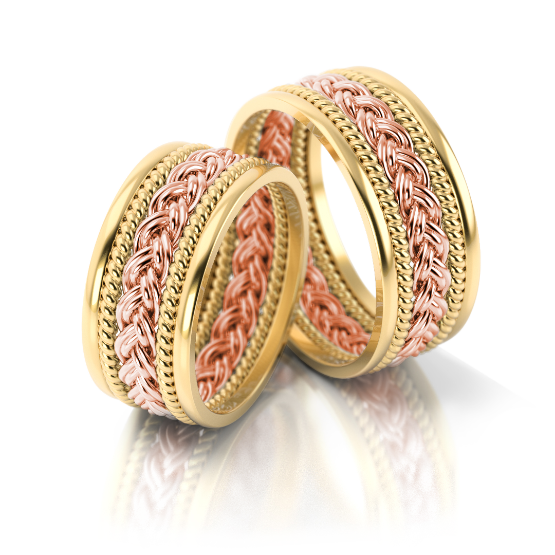 Jedes Ringpaar wird in traditioneller Goldschmiedearbeit gefertigt und individuell auf Kundenwunsch angepasst. Durch das aufwendige Flechtmuster ist jeder Ring ein Unikat – so einzigartig wie die Liebe, die er symbolisiert.