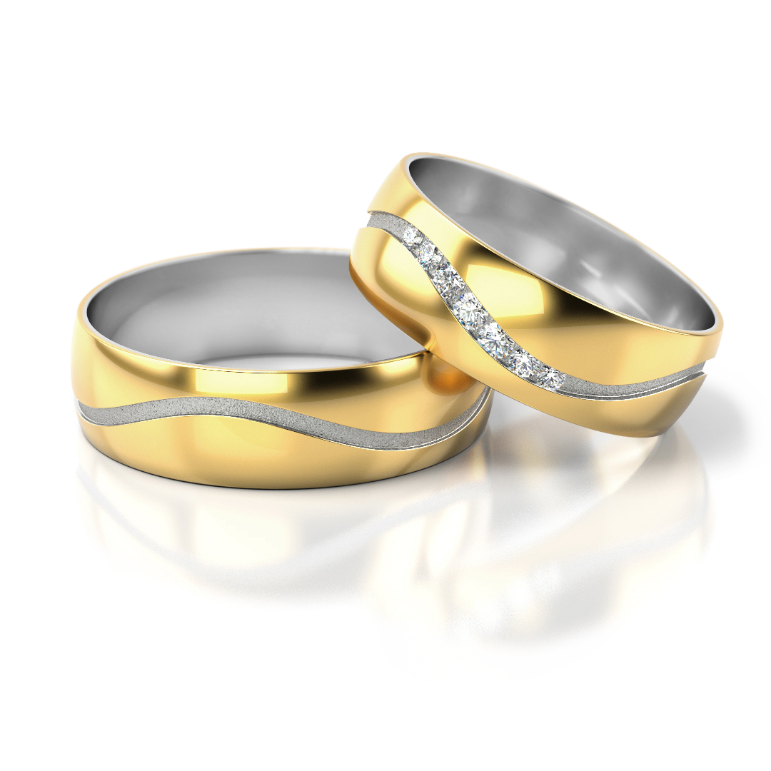 Ein Ring ist mit fein gefassten Diamanten versehen, die entlang der fließenden Linie eingesetzt sind und dem Design eine dezente, aber luxuriöse Brillanz verleihen. Diese Trauringe symbolisieren Bewegung, Zusammenhalt und den gemeinsamen Weg zweier Menschen – ideal für Paare, die modernes Design mit zeitloser Bedeutung verbinden möchten.