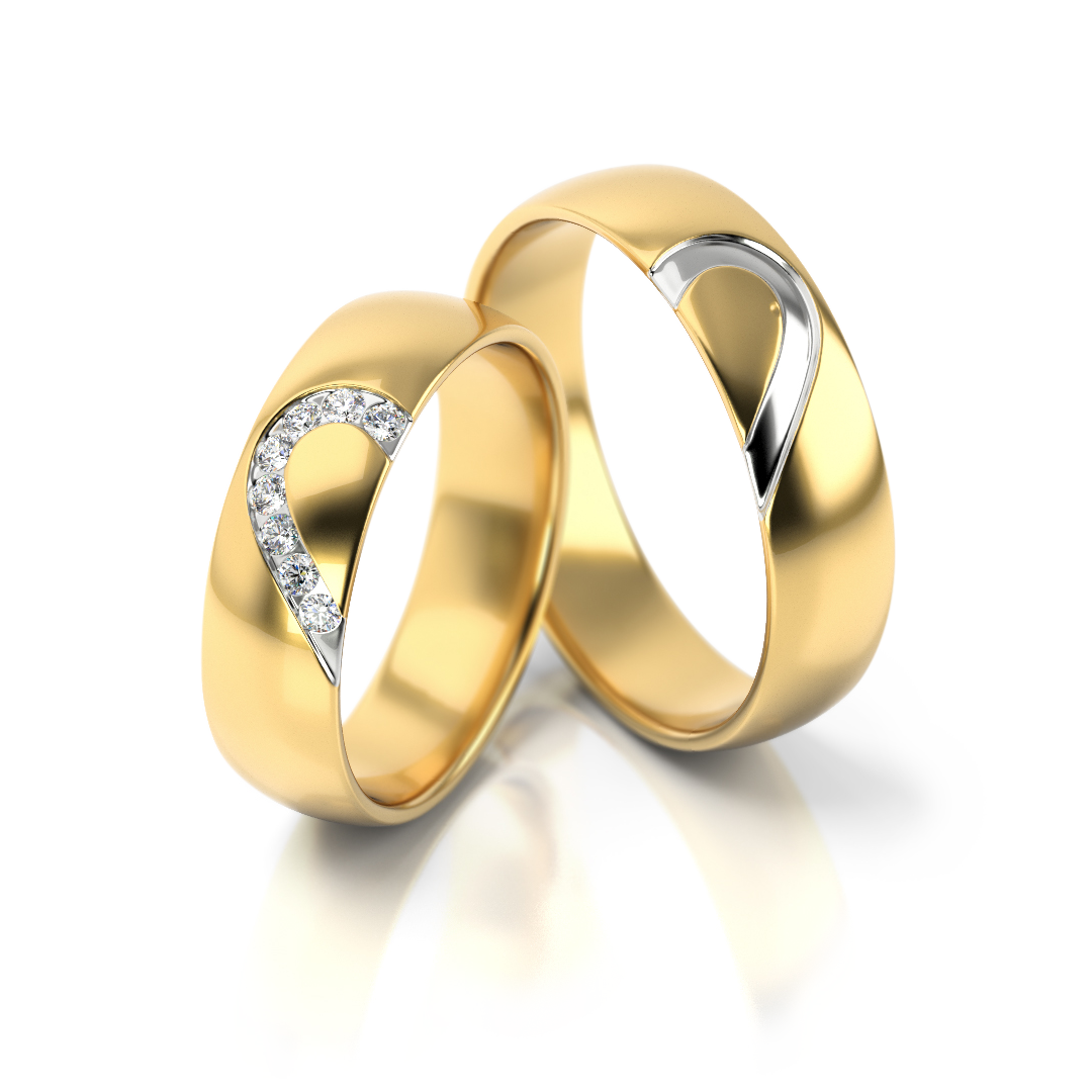 Romantische Trauringe Nr. 315 mit sanft geschwungenem Herzmotiv und funkelnden Steinen im Damenring. Die fließende Form symbolisiert Liebe, Nähe und Verbundenheit. Erhältlich in Gelbgold, Weißgold und Roségold mit Diamanten oder Labordiamanten.