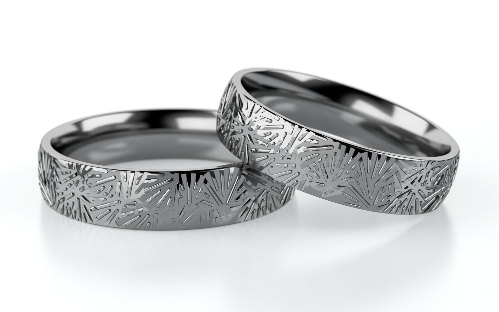 Die feine, geometrisch anmutende Gravur sorgt für einen faszinierenden visuellen Effekt, der das Licht auf vielfältige Weise reflektiert und den Ringen eine besondere Tiefe verleiht. Die dunkle, metallische Farbe des Tantals harmoniert perfekt mit dem dynamischen Muster und macht die TA04-Trauringe zu einer eindrucksvollen Wahl für Paare, die Wert auf Individualität und ausdrucksstarkes Design legen.