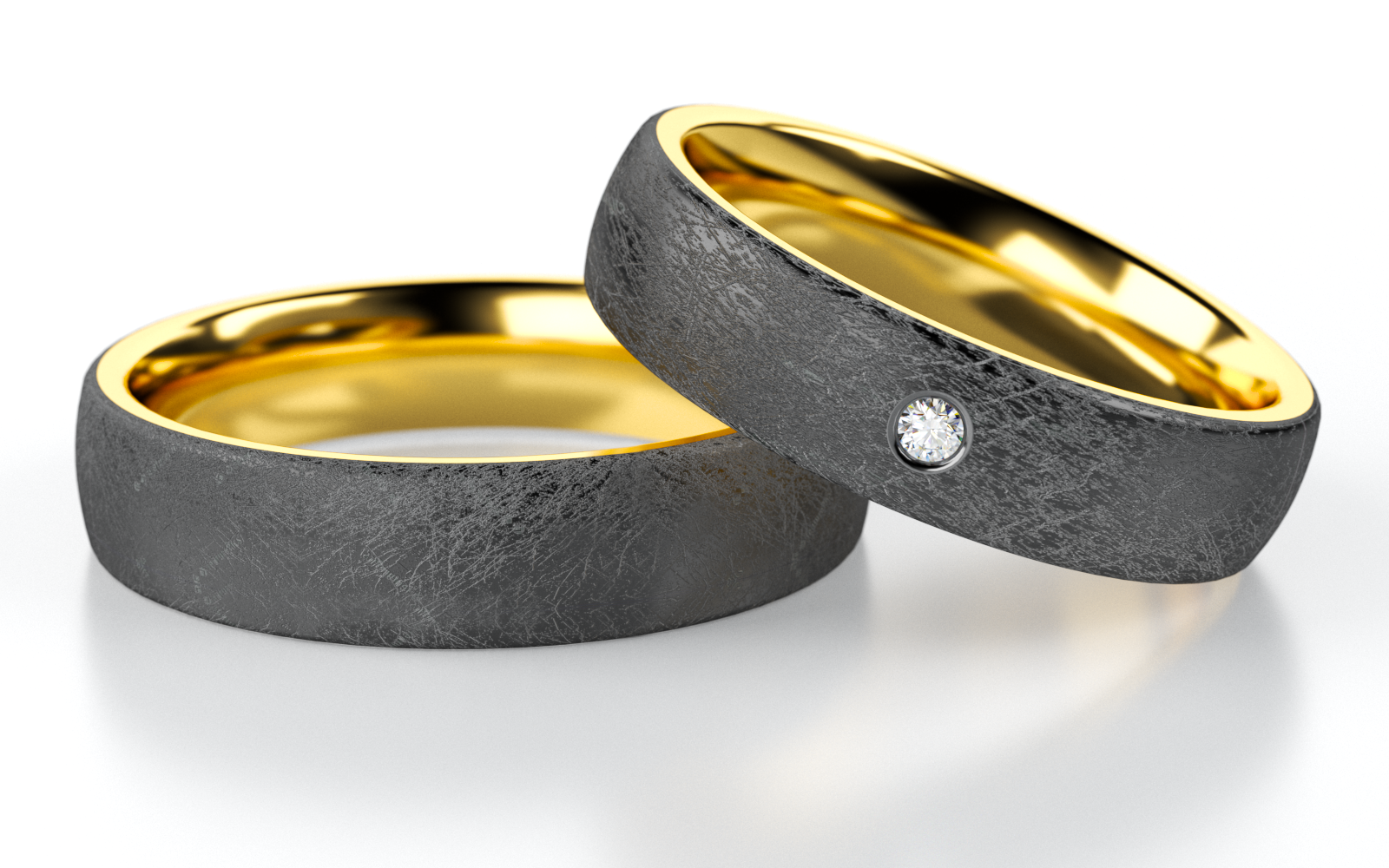 Die markant mattierte Oberfläche des Tantals zeigt feine Linien und ein leicht raues Muster, das den Ringen eine natürliche, charaktervolle Note verleiht. Im Inneren sorgt das hochglanzpolierte Gelbgold für ein edles Strahlen und einen spannenden Farbkontrast. Der Damenring wird durch einen dezent gefassten Diamanten ergänzt, der sich harmonisch in das Tantal einfügt und einen funkelnden Akzent setzt. Diese Kombination aus strukturiertem Anthrazit, warmem Gold und feinem Brillantbesatz verleiht TA11 eine exklusive, moderne Ausstrahlung.
