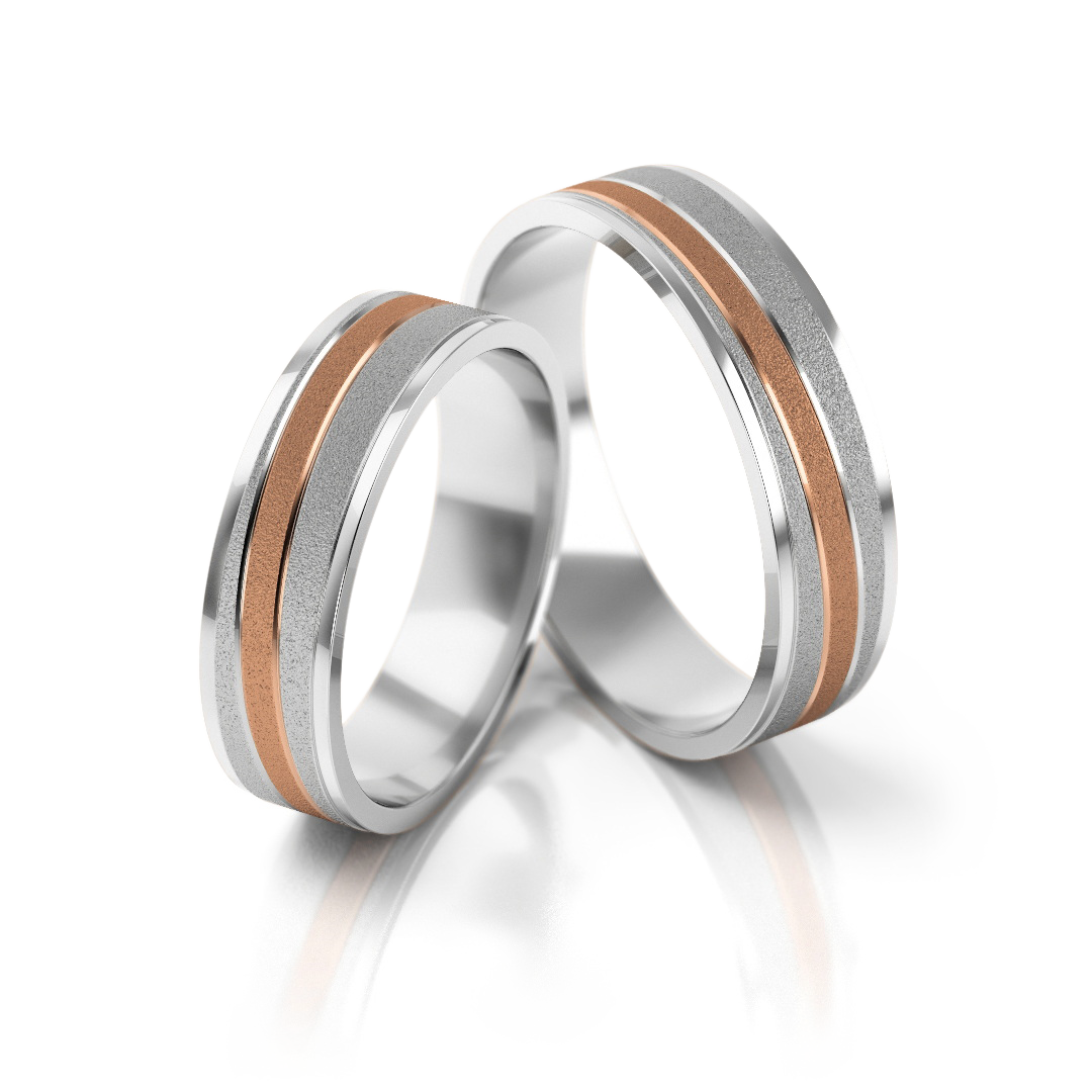 Die Trauringe in Bicolor aus Weißgold und Roségold (333, 375, 585 oder 750) verbinden zurückhaltendes Design mit moderner Ästhetik. Die mattierte Oberfläche wird durch feine, polierte Linien dezent akzentuiert und verleiht den Ringen eine zeitgemäß-elegante Optik.