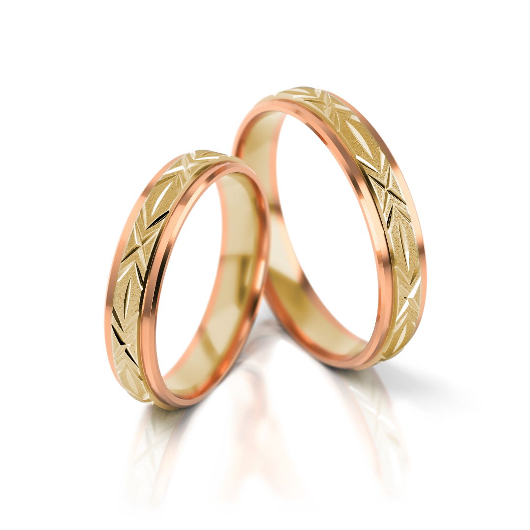 Stilvolle Bicolor-Trauringe aus klassischem Gelbgold und modernen Roségold mit feinem, geometrischem Muster – ein Design, das Klassik und Moderne verbindet. Erhältlich in Legierungen von 333 bis 750. Diese Ringe sind ein Symbol zeitloser Liebe und begleiten euch elegant durch euer gemeinsames Leben. Breite: 4,3 mm, Höhe: 1,2 mm