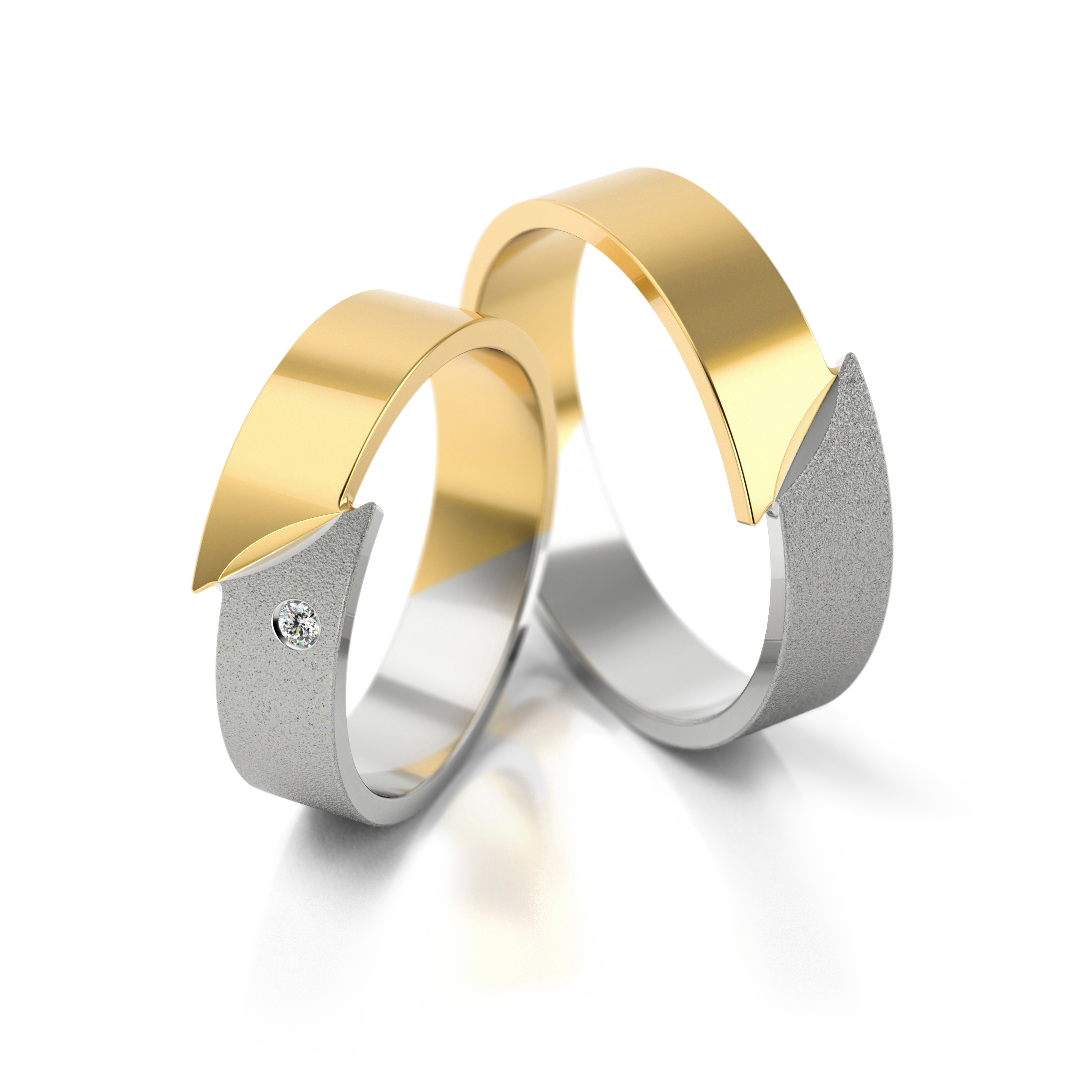 Partnerringe aus Gelbgold und Weißgold mit Stein und charakteristischem Schrägdesign – ein Symbol moderner, grenzenloser Liebe. Breite: 4.6 mm, Höhe: 1.25 mm