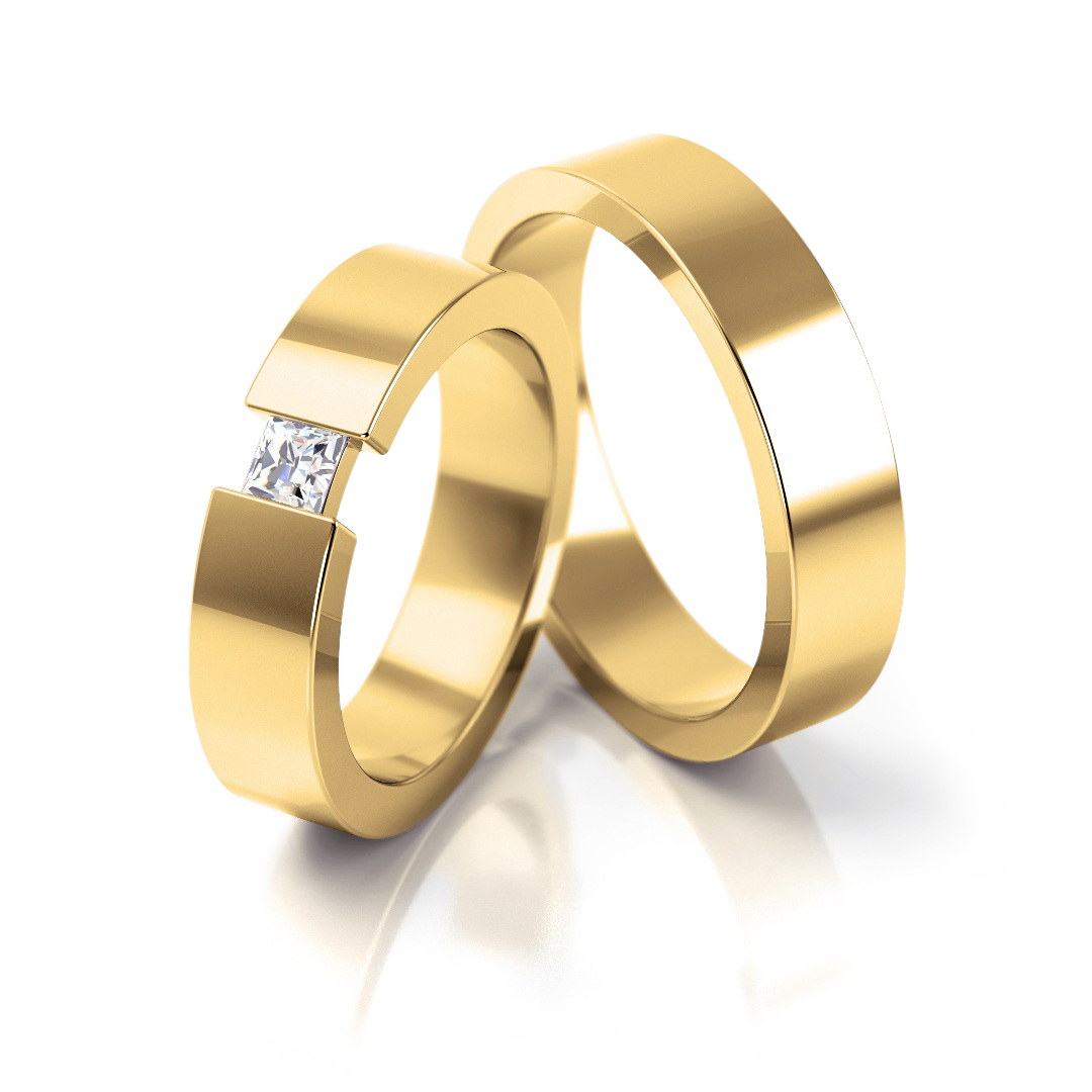Elegante Eheringe im Stil Pure Eleganz, erhältlich in Weißgold, Gelbgold oder Roségold (333–750). Der Damenring ist mit einem frei schwebenden Stein im Spann-Design verziert – wahlweise Diamant, Labordiamant . Zeitlos, modern und äußerst komfortabel zu tragen. Technische Details: Modellnummer: 164 Breite: 5 mm Höhe: 2,3 mm Gesamtkarat (Stein): 0,16 ct