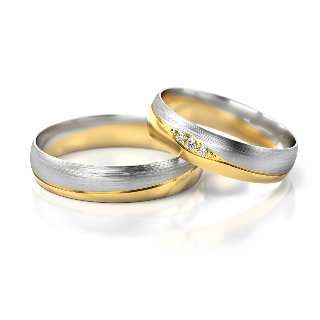 Trauringe Nr. 275 mit fließendem V-Motiv, das Wellenbewegung, Verbindung und Symbiose symbolisiert. Die harmonische Linienführung und der dezente Steinbesatz im Damenring verleihen dem klassischen Design eine moderne, bedeutungsvolle Tiefe. Erhältlich in Gelbgold, Weißgold, Roségold sowie in verschiedenen Bicolor-Varianten. Breite: 4,5 mm, Höhe: 1,3 mm, Gesamtgewicht der Steine: ca. 0,035 ct