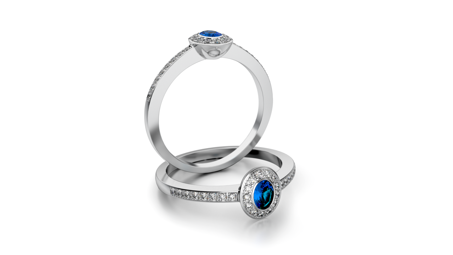 Der Verlobungsring ST12 aus Weißgold besticht durch seine filigrane Eleganz und eine harmonische Edelsteinkombination. Im Zentrum steht ein ovaler Saphir in der Größe 4 × 3 mm, der dem Ring eine dezente Farbintensität und eine besondere Ausstrahlung verleiht. Umrahmt wird der Saphir von funkelnden Diamanten, die das Licht sanft reflektieren und den Edelstein stilvoll hervorheben.
