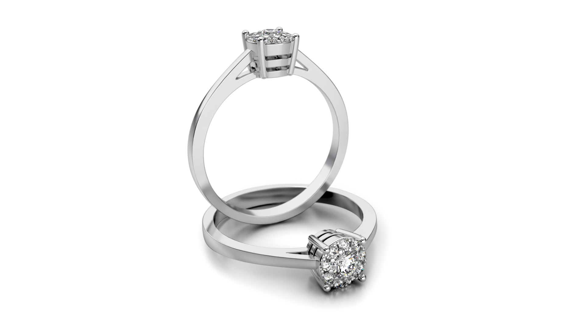 Der Verlobungsring ST15 aus Weißgold besticht durch seine edle Erscheinung und eine besonders harmonische Diamantfassung. Im Zentrum steht ein funkelnder Diamant, der von weiteren Diamanten umgeben ist und dem Ring eine intensive Strahlkraft verleiht. Diese raffinierte Anordnung sorgt für ein luxuriöses, dennoch ausgewogenes Gesamtbild.