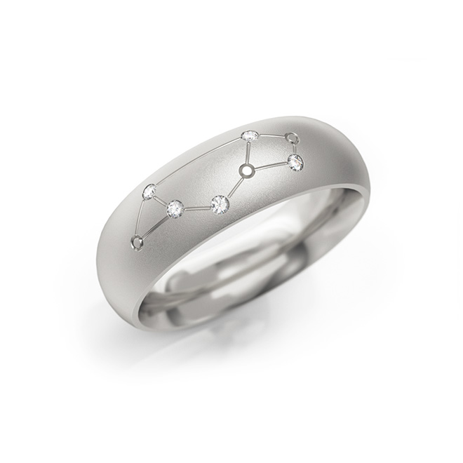 Eleganter Bandring aus mattiertem, satiniertem Weißbgold (333–750), verziert mit dem Sternbild Schütze. Die feine Liniengravur wird durch funkelnde Diamanten, Labor-Diamanten akzentuiert und verleiht dem Ring eine besondere, persönliche Note. Auf Wunsch ist zudem eine individuelle Gravur möglich. Das Sternzeichen Schütze steht für Freiheit, Abenteuerlust und Optimismus – Eigenschaften, die dieser Ring auf stilvolle Weise widerspiegelt. Höhe: 2,4 mm Breite: 6 mm